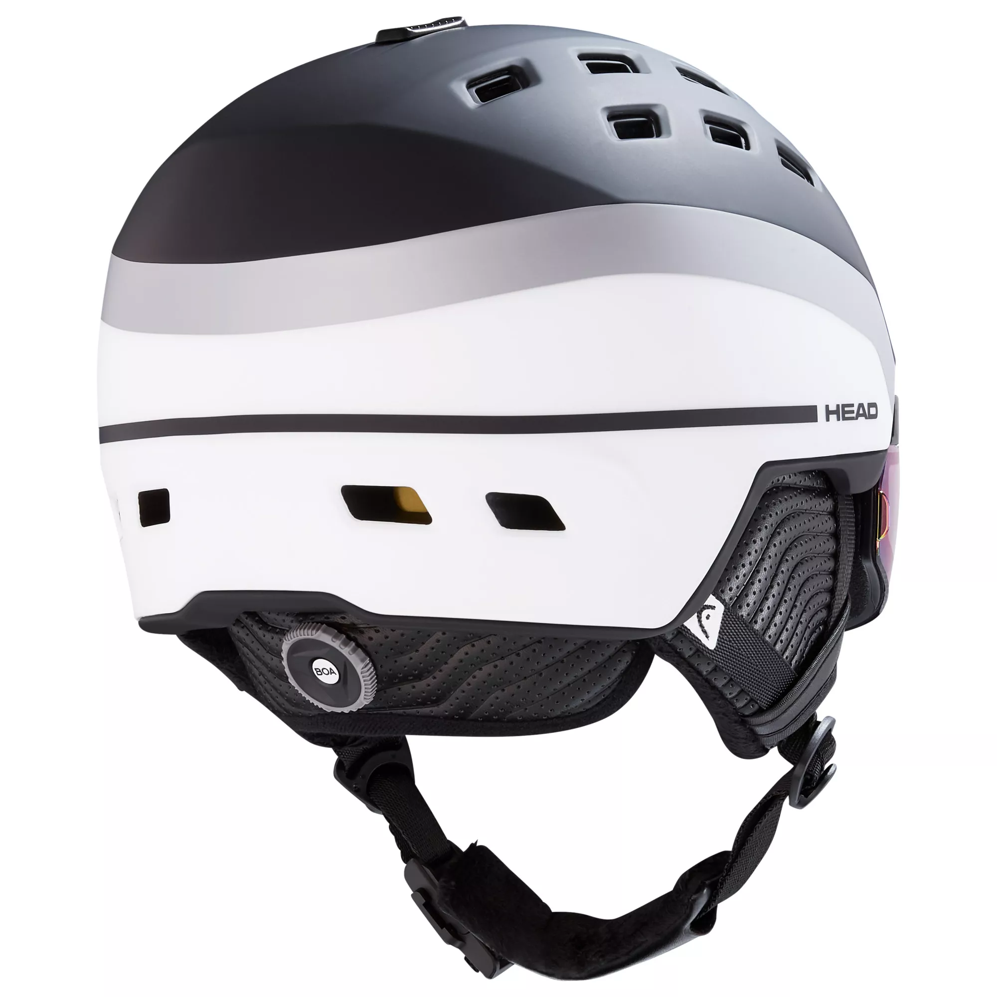 Визор шлемов мужской серии RADAR и женской серии RACHEL имеет уникальную запатентованную конструкцию гибкого крепления к шлему на плетеных резиново-кевларовых поводках с клипсами. Такое крепление надежно удерживает визор, а также быстро и удобно фиксирует его в открытом или закрытом положениях, что особенно может быть важным для тех горнолыжников, которые носят диоптрические очки и катаются в них.
